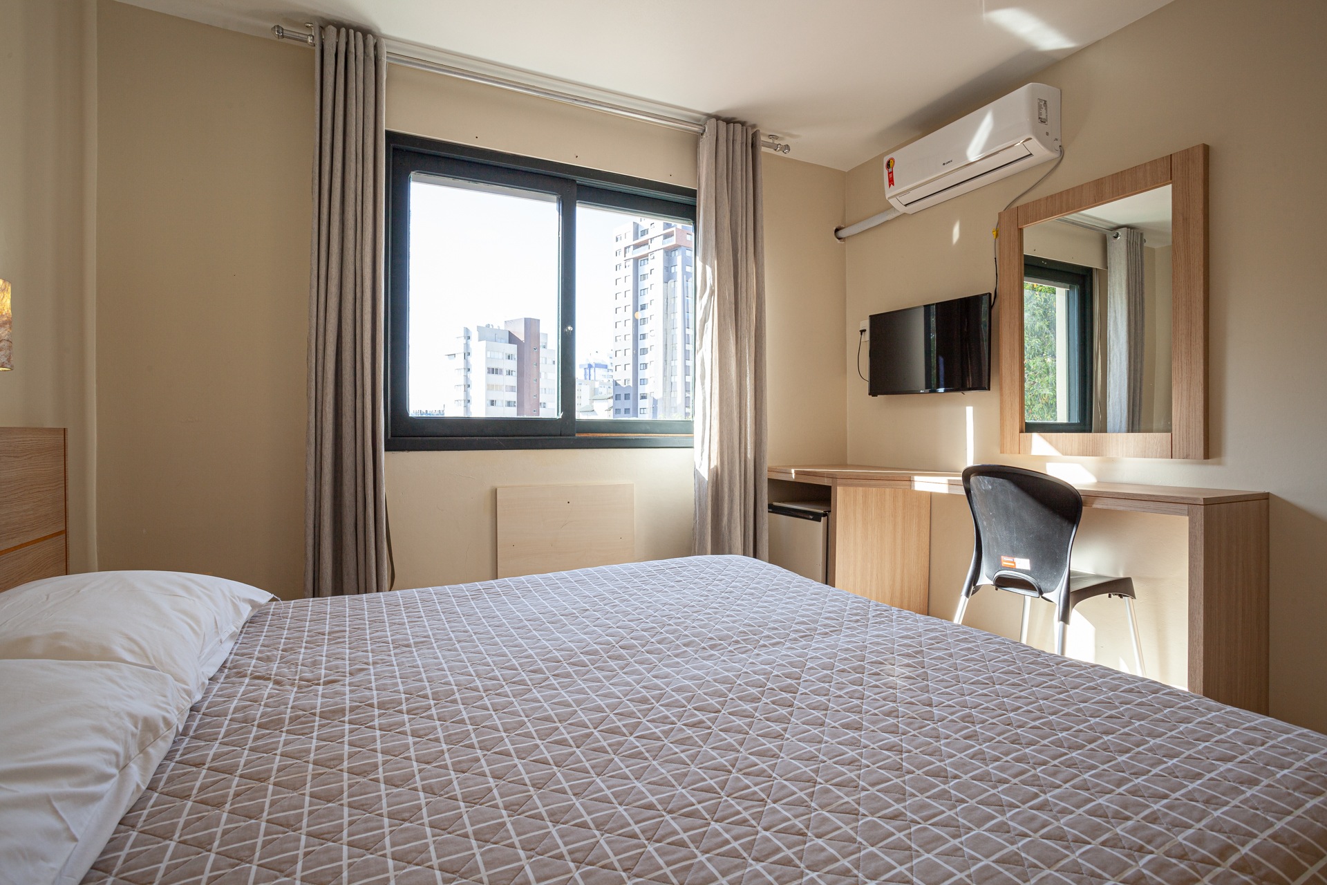 Apartamento com dois ambientes, vista externa, dois ares-condicionados.